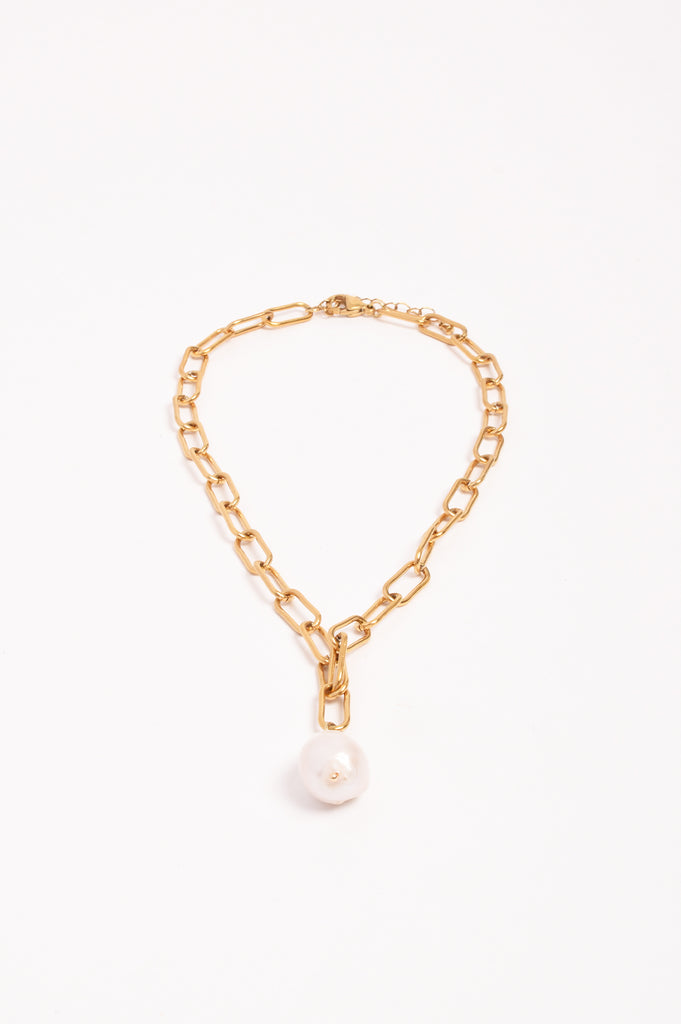 Rectangle Link Baroque Pearl Drop Necklace (Gold)