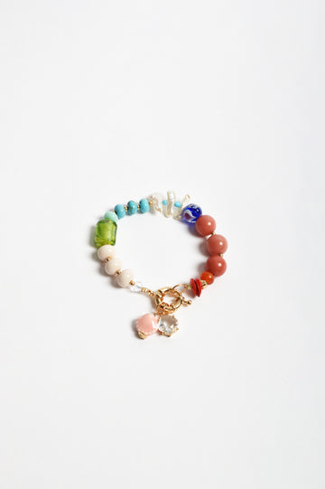 The Summer Mix Bead Bracelet in Multi is a mixed bead design finished with shell and stone charms. It secures with a spring ring clasp and is crafted from pearl, shell, stone and plated metal.