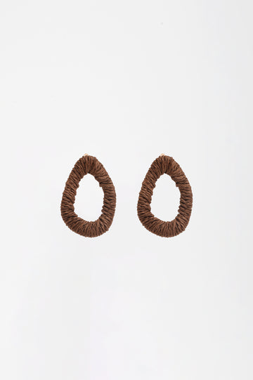 The Wrapped Organic Shape Earrings in Chocolate feature an abstract design wrapped in fabric. Secured with a stud-back closure.