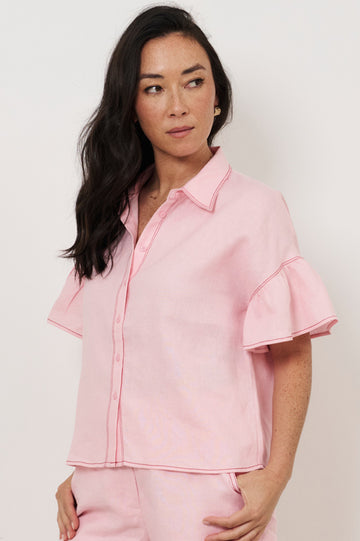The Alex Contrast Stitch Linen Shirt in Pink features a V-neckline with a collar and short bell sleeves. Designed with a button-through front and contrast stitch detailing, it has a relaxed silhouette and is crafted from 100% linen for lightweight, breathable wear.