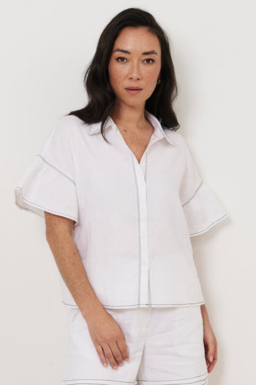 The Alex Contrast Stitch Linen Shirt in White features a V-neckline with a collar and short bell sleeves. Designed with a button-through front and contrast stitch detailing, it has a relaxed silhouette and is crafted from 100% linen for lightweight, breathable wear.
