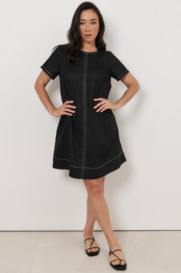 The Lexi Contrast Stitch Dress in Black is a relaxed short dress with a round neckline and short sleeves. Featuring contrast stitch detailing, side pockets, and a loop-and-button back closure, it’s unlined and crafted from 100% linen.
