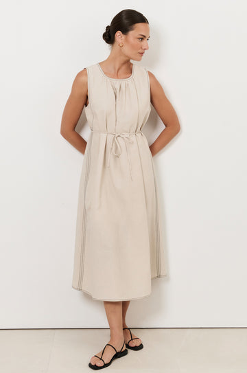The Katrina Contrast Stitch Dress in Stone features a relaxed silhouette with contrast stitching and a round neckline. Designed with a pleated front, waist tie for added shape, and finished with a button-and-loop back closure.