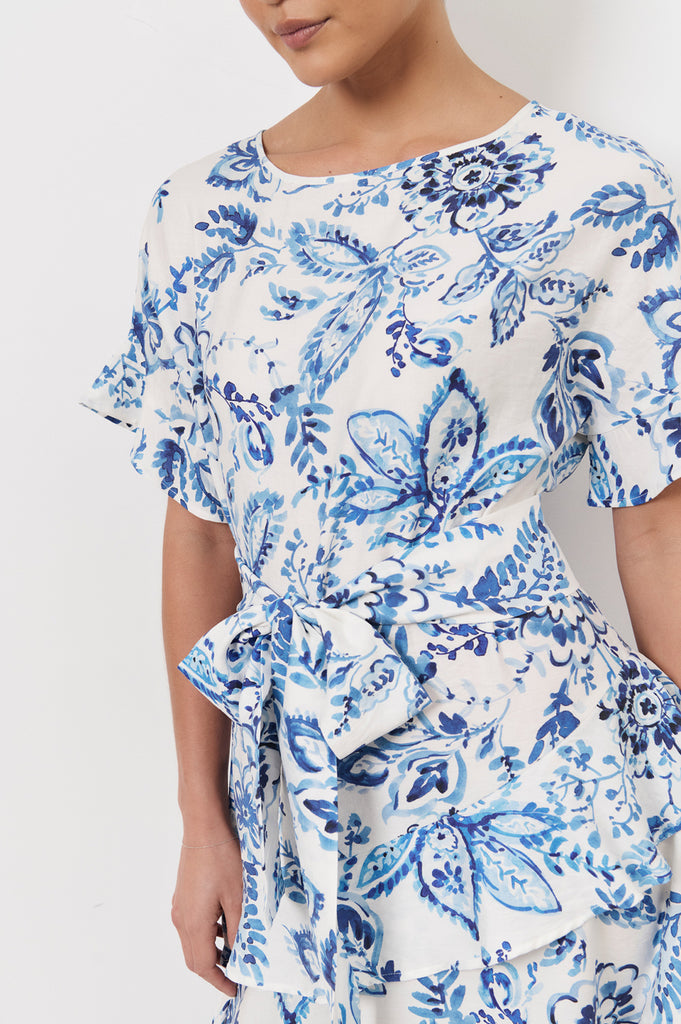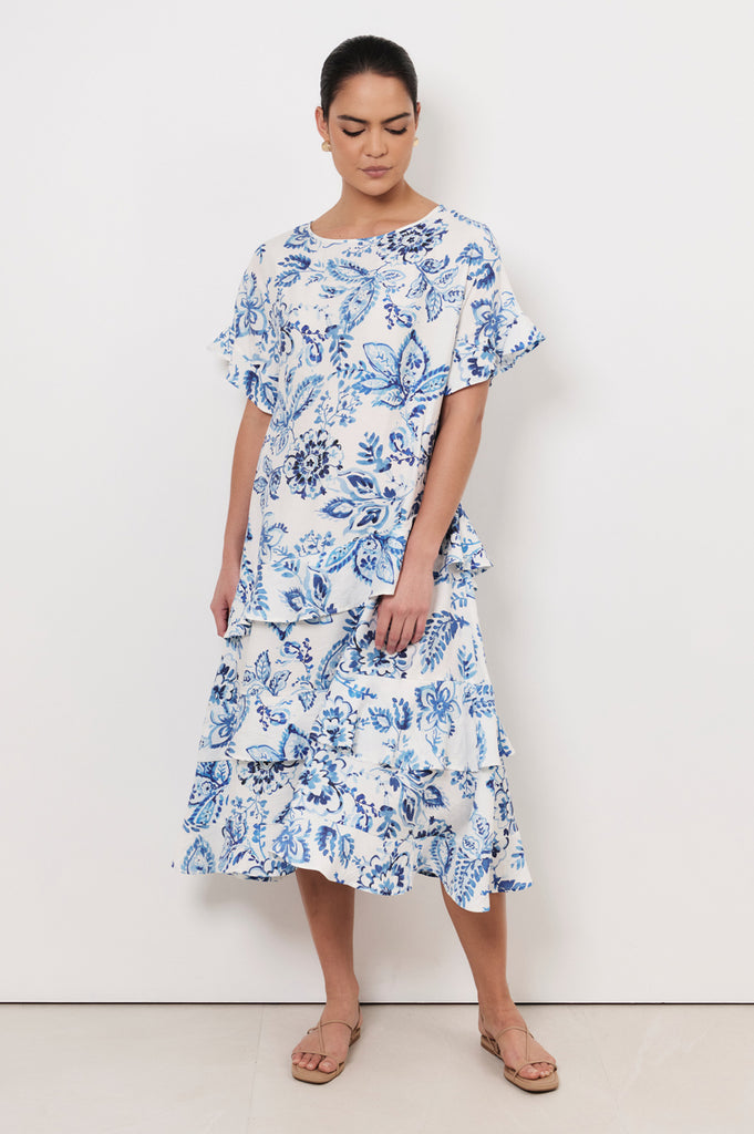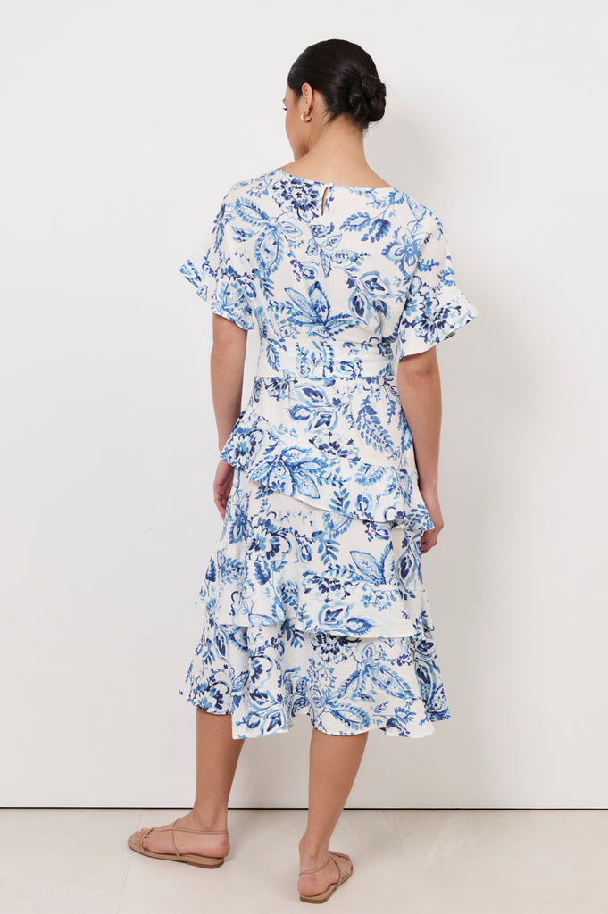 The Alana Midi Dress in Print is crafted from a lightweight blend with blue and white floral print. Designed with a round neckline and short flutter sleeves, it features an optional waist tie and an asymmetrical tiered hem.