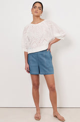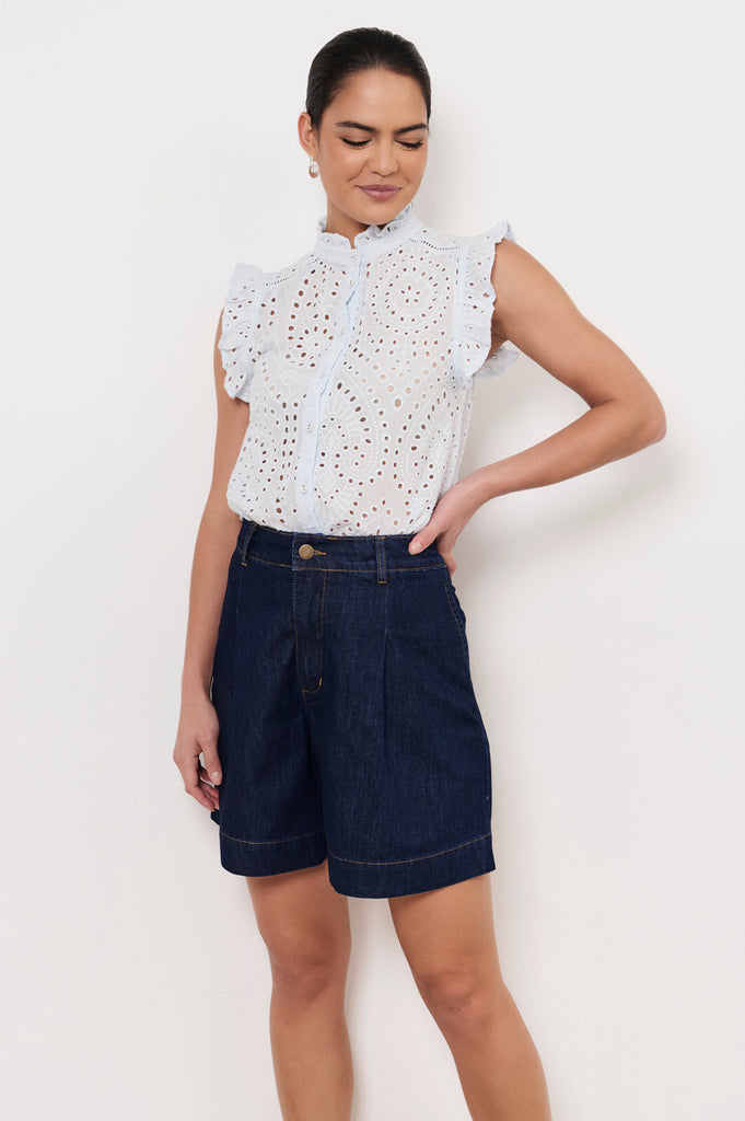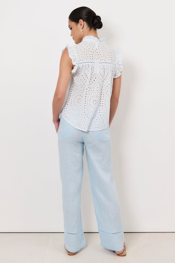 The Bree Broderie Anglaise Top in Light Blue features delicate broderie anglaise detailing with a button-down front and self-covered buttons. Finished with a frilled neckline, short frill sleeves, and ladder lace accents.