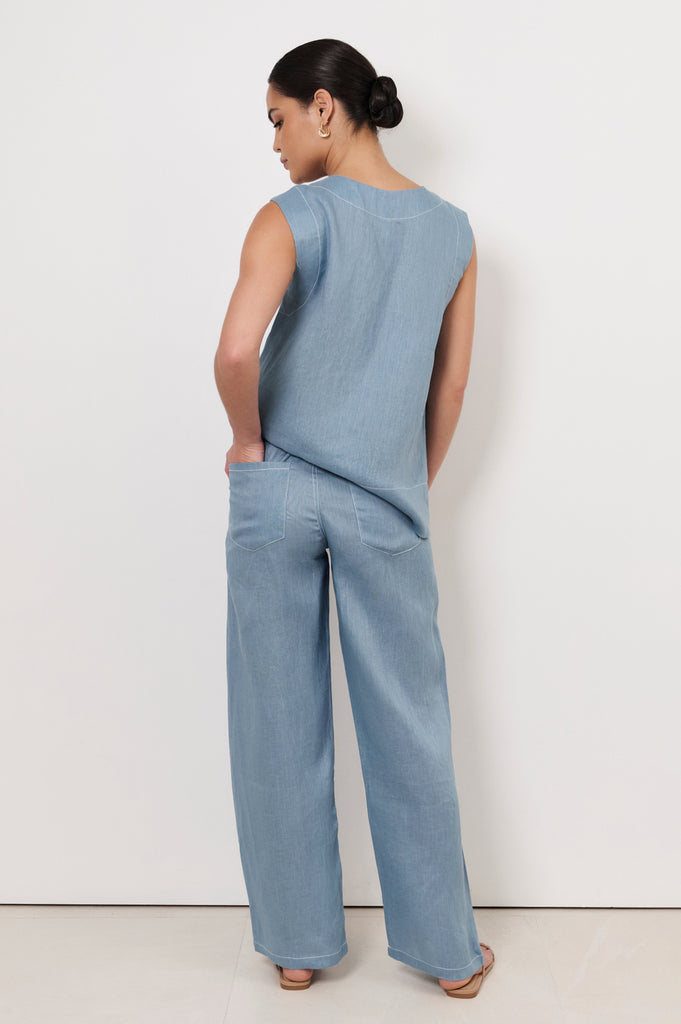 The Chandler Drawstring Linen Pant in Blue is crafted from 100% linen and cut to a relaxed, straight-leg silhouette. Designed with an elasticised waist, drawstring tie, and metal clip-and-zip closure for an adjustable fit.
