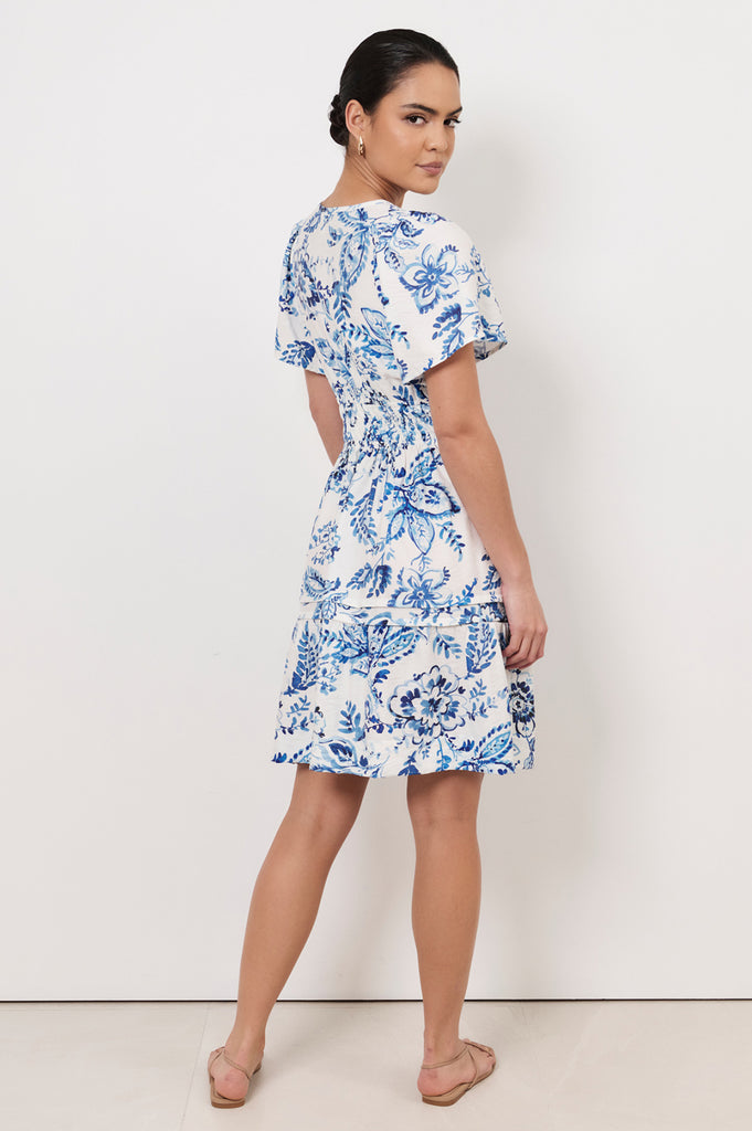The Eliana Short Sleeve Short Dress in Print features a blue and white floral print, a round neckline, a subtle V-split opening, and a softly gathered waist. Designed with short sleeves, a tiered hem, and functional side pockets, it offers a relaxed and effortless silhouette.