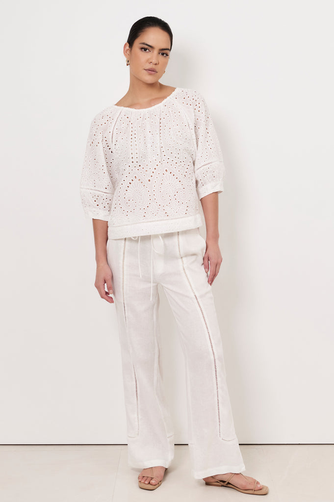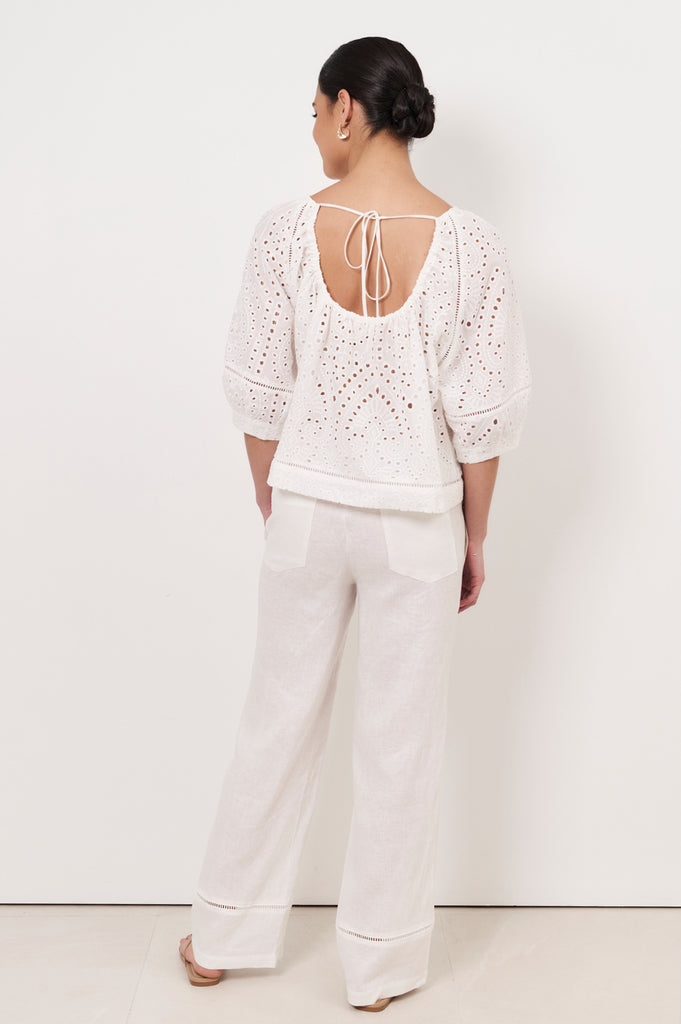 The Maison Trim Detail Linen Pant in White is crafted from 100% linen for a light and breathable feel. Designed in a straight-leg silhouette with ladder lace inset detailing, it features an elasticated back waistband with a drawstring and back patch pockets for a relaxed finish.