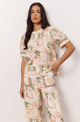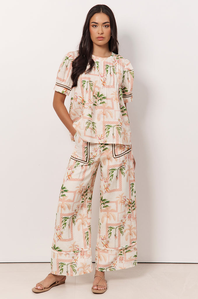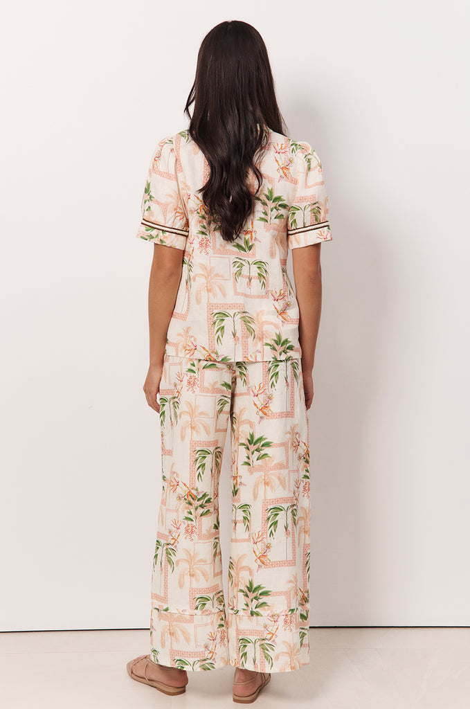 The Gabriella Print Linen Pant in an exclusive adorne print is crafted from 100% linen. It features a wide-leg silhouette with a contrast woven trim, belt loops, and non-functional back pockets. Fully lined and finished with a zip fly and button closure.
