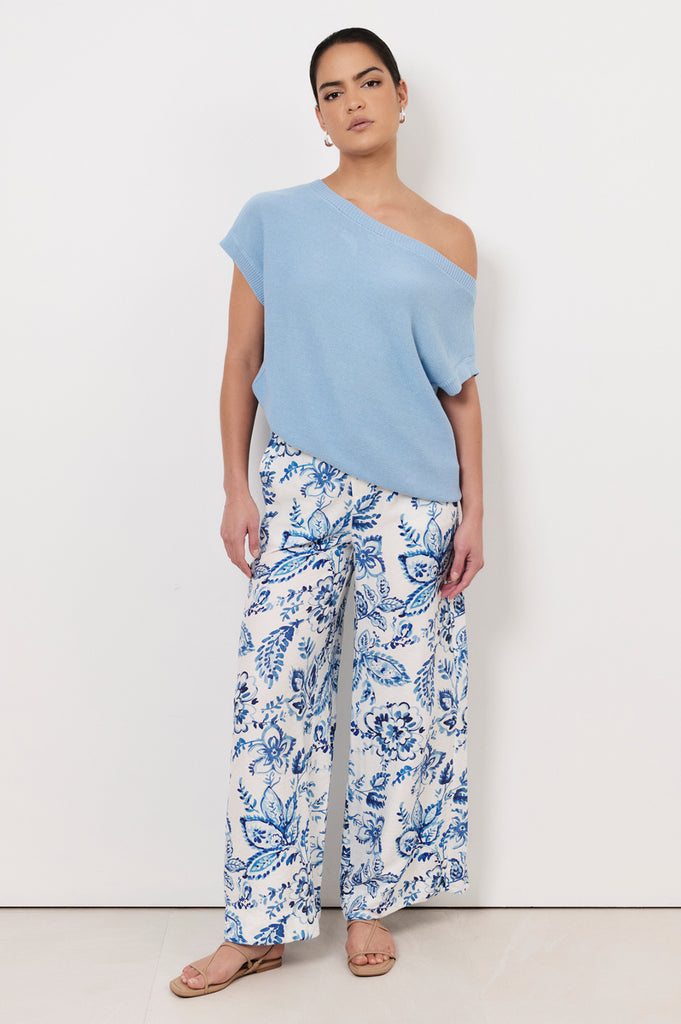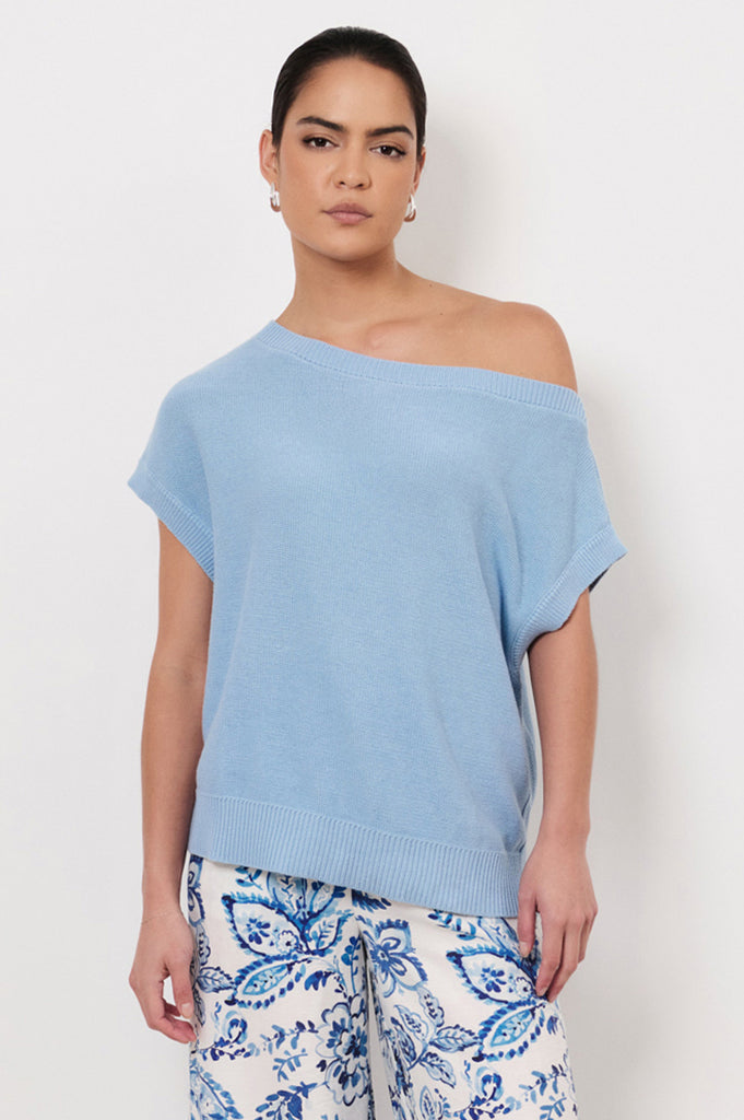 Terrie Angled Neckline Cotton Knit Top (Blue)