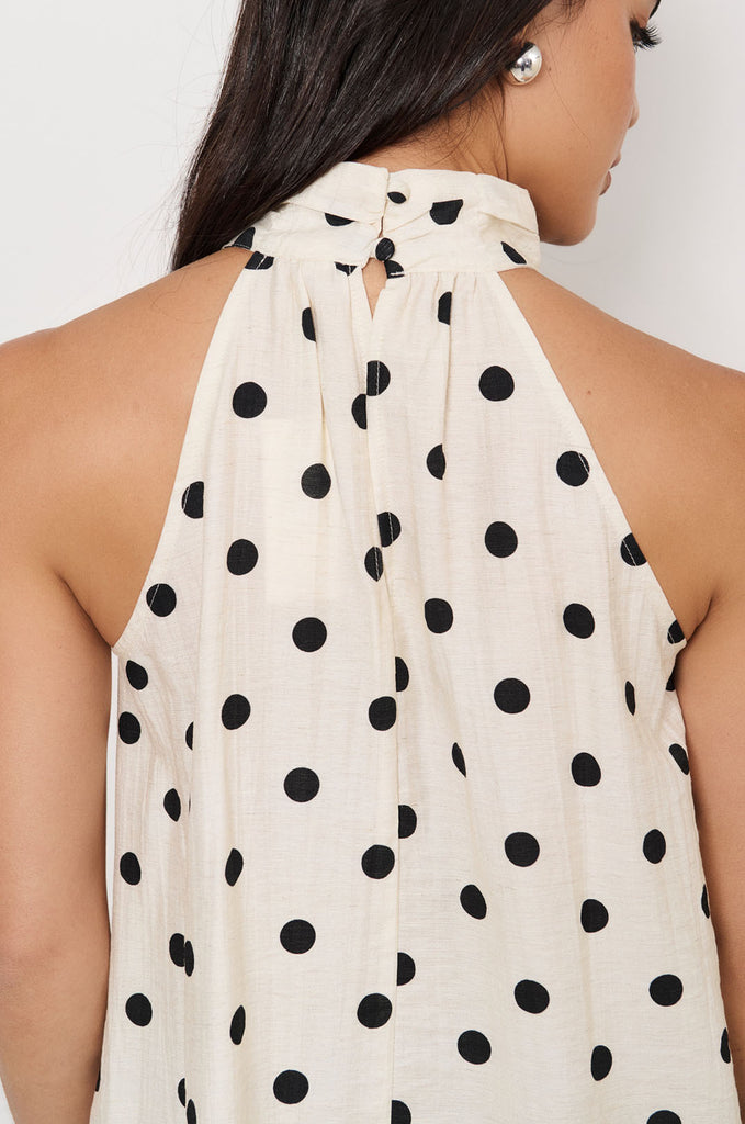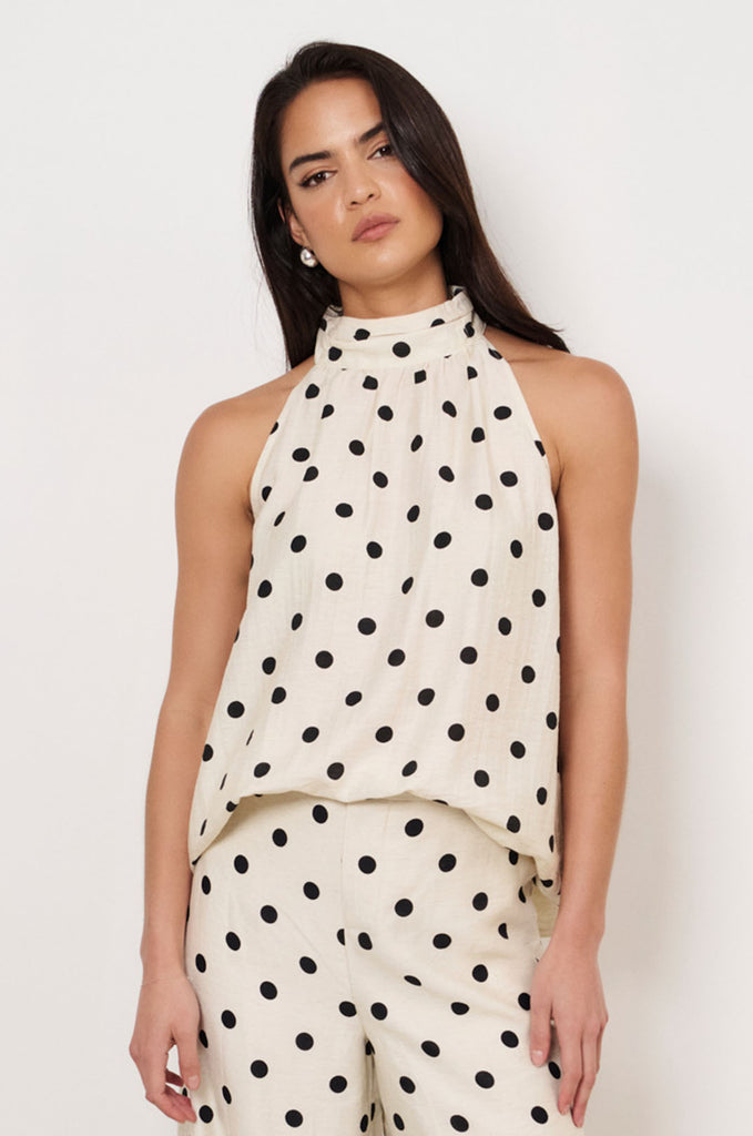 The Kendra High Neck Top in Spot is crafted from 100% linen with a soft cotton lining. Designed in a halter style with a high neckline, it features a polka dot print and a button-and-loop closure at the back.