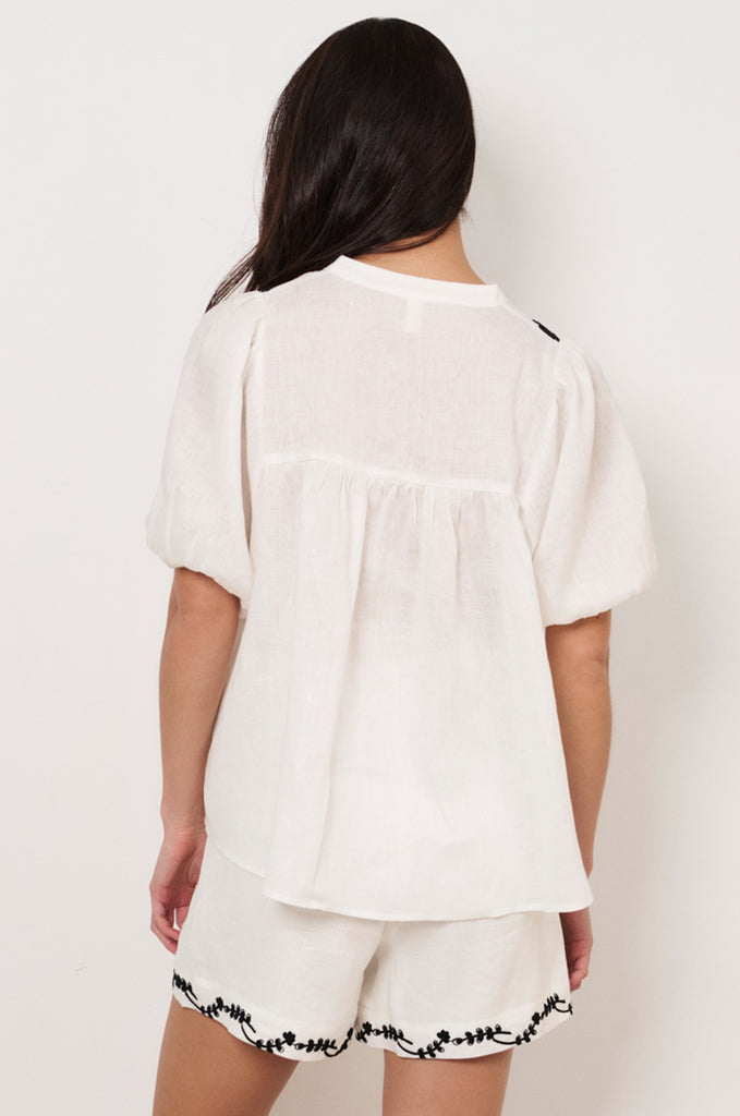 The Palmer Embroidered Boho Top in White is crafted from 100% linen with floral embroidery. Designed with puff sleeves and elastic cuffs, a mandarin collar, and an open V-neckline, it features a button-down front with self-covered buttons.