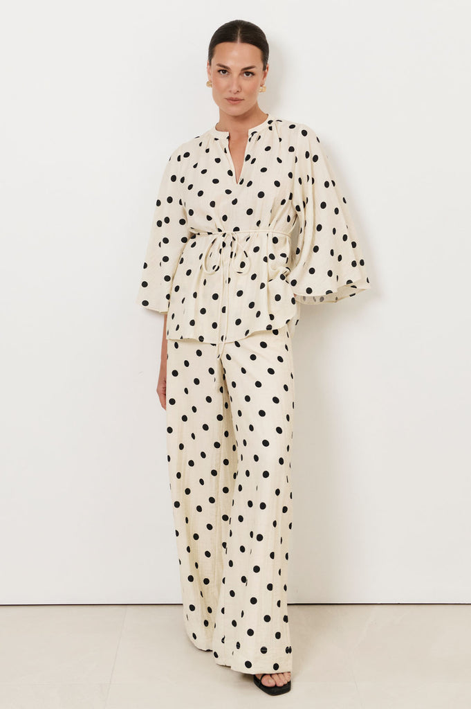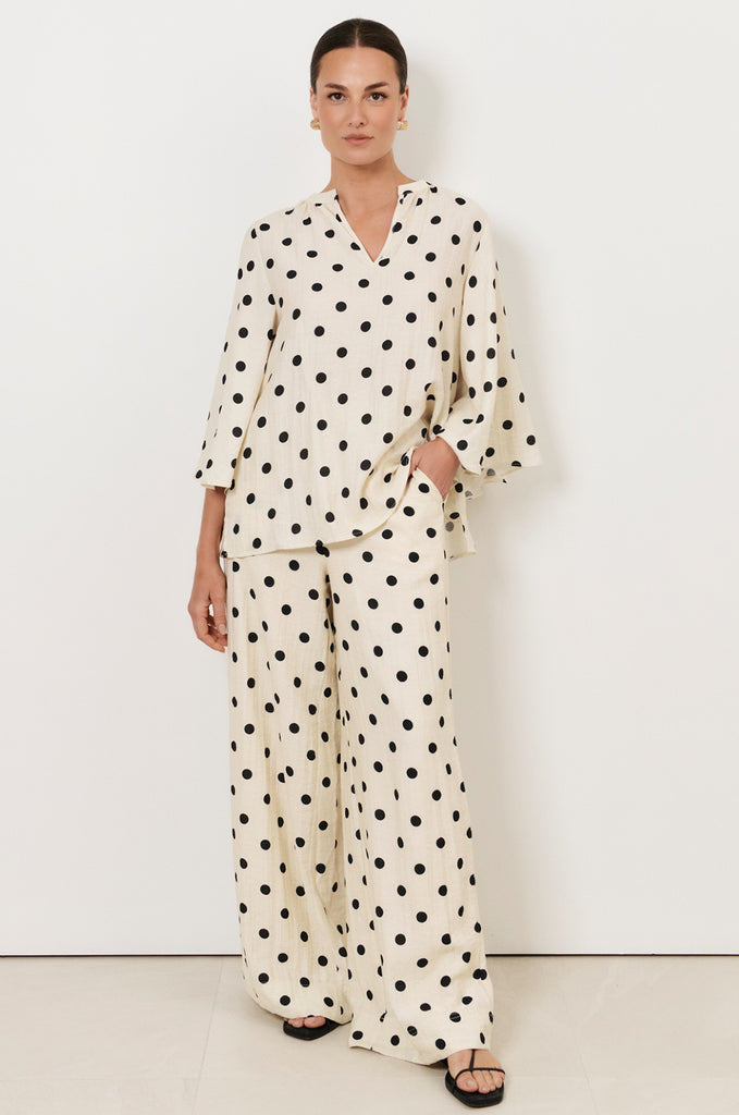 The Parker Wide Leg Pant features a polka dot print in a relaxed silhouette. Designed with side pockets and an elastic waist, it’s finished with a button and zip closure. Crafted from a lightweight blend of nylon, linen and rayon.