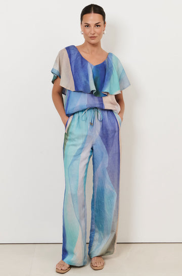 The Kelly Print Pant in Print is designed in an exclusive adorne print. Featuring a relaxed silhouette, they are made from a sheer, lightweight fabric with internal lining, an elasticated drawstring waist with silver eyelets, and side seam pockets.