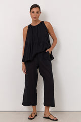 The Ariah Sleeveless Top in Black is crafted from cotton and features a round gathered neckline with a tie-back closure. Designed with a tiered hem and relaxed silhouette.