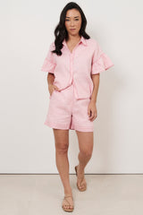The Alex Contrast Stitch Linen Shirt in Pink features a V-neckline with a collar and short bell sleeves. Designed with a button-through front and contrast stitch detailing, it has a relaxed silhouette and is crafted from 100% linen for lightweight, breathable wear.