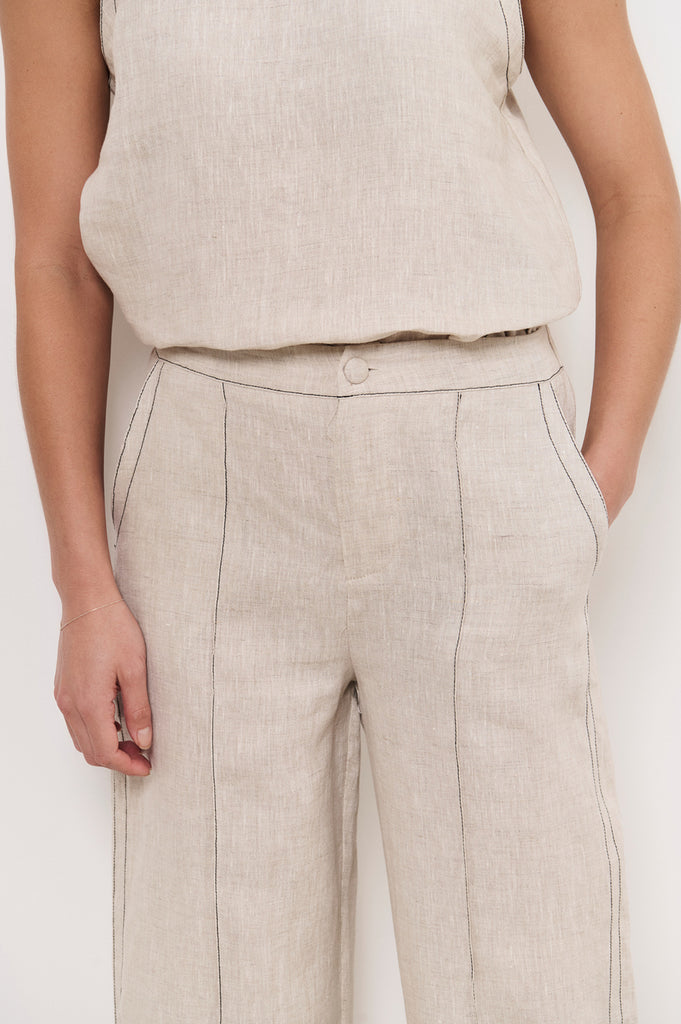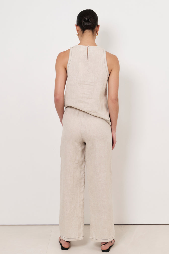 The Alessia Contrast Stitch Linen Pant in Natural is crafted from 100% linen and designed with a relaxed silhouette. Featuring a zip and button closure, elasticised waistband, and two front pockets, it’s finished with subtle contrast stitching.