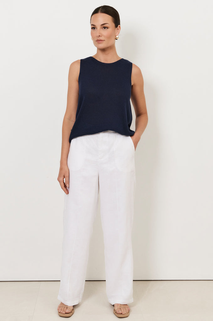 The Alessia Lined Linen Pant in White is designed for effortless, everyday wear. Made from 100% linen and fully lined for comfort, it features a classic zip and button closure, an elasticised waistband and functional front pockets.