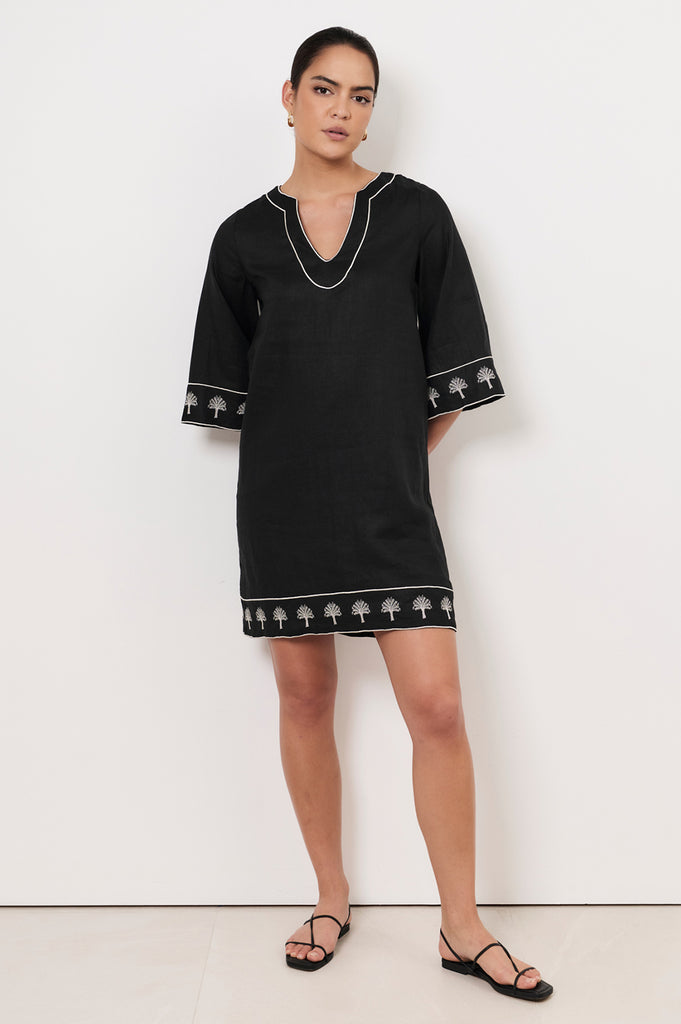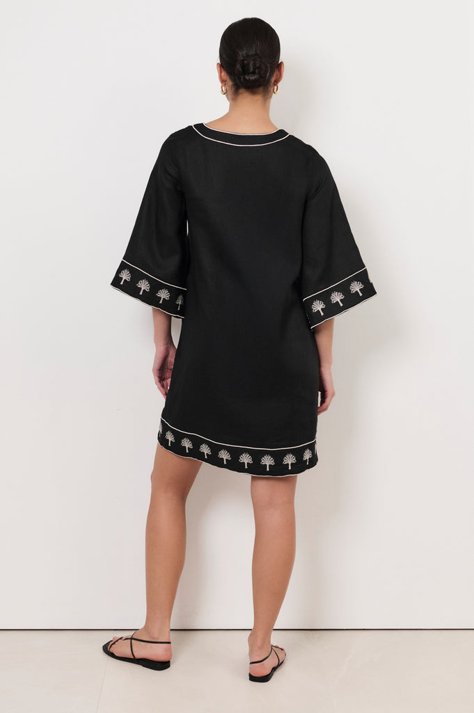 The Amora Kaftan Short Dress in Black is made from 100% linen and designed with a relaxed silhouette. It features a deep scoop neckline, kaftan-style sleeves, and side splits at the hem, finished with palm tree embroidery and contrast stitching.