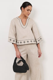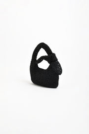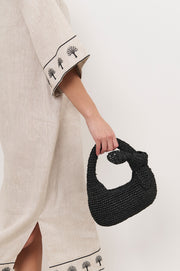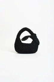 The Bow Handle Mini Basket in Black features a top handle, zip closure, and internal pocket. Crafted from paper raffia and fully lined.