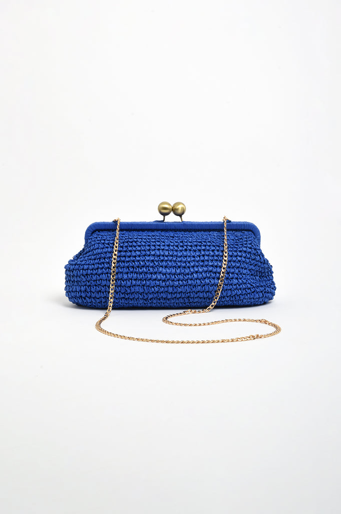 The Clip Top Elongated Clutch in Colbat is an unstructured clutch crafted from woven raffia and finished with a metal clip closure. It includes an optional chain strap, an internal pocket and a fabric-lined interior. Made from paper raffia with plated metal detailing.