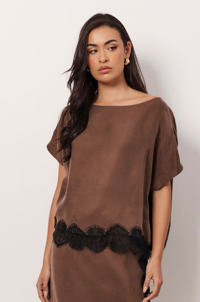 The Dali Cupro Lace Detail Top in Chocolate is cut from a soft cupro blend. It features a boat neckline, mid sleeves, and black lace trim, finished in a relaxed fit.