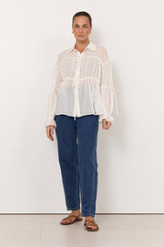The Darby Tie Detail Shirt is crafted from sheer cotton with a relaxed silhouette. Designed with a button-down front featuring self-covered buttons, long sleeves with elasticated cuffs, and a tiered construction finished with tie details.