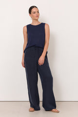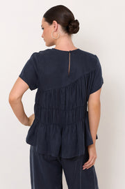 The Evren Cupro Top in Navy is made from a soft cupro blend. It features a round neckline, gathering through the bodice, and a relaxed silhouette.