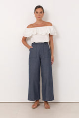 The Gabriella Stripe Denim Pant features a striped lightweight denim with a wide leg silhouette. Designed with belt loops, front patch pockets and faux back welt pockets, it’s finished with a zip fly and button closure.
