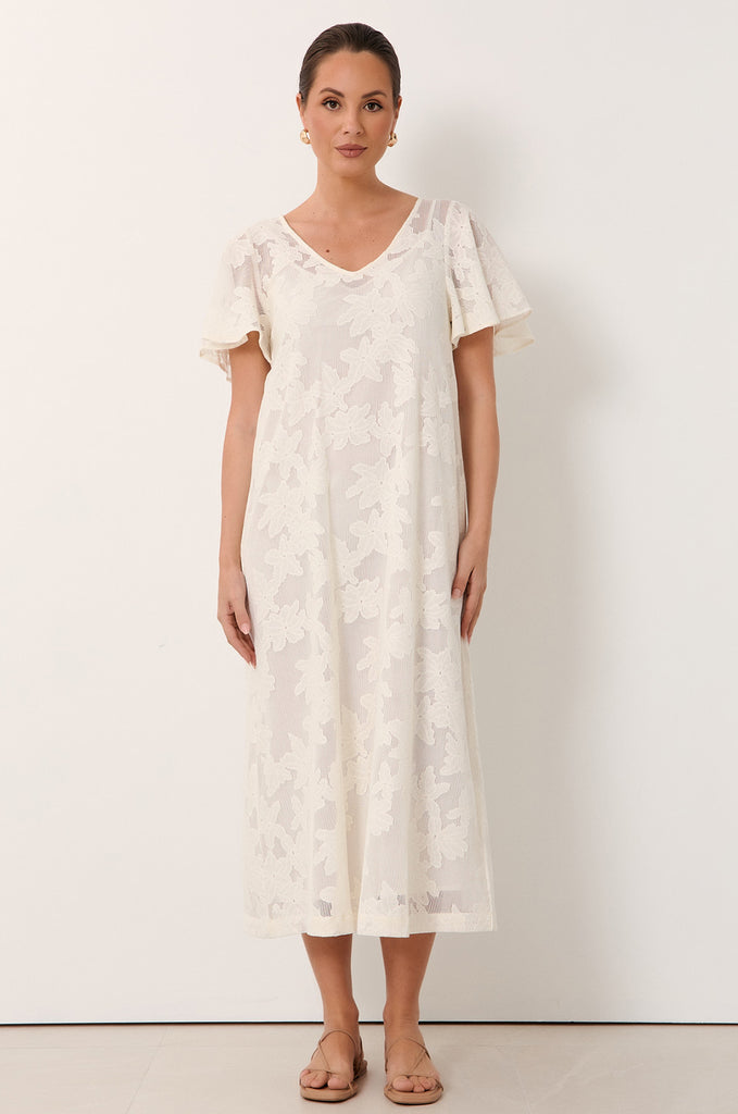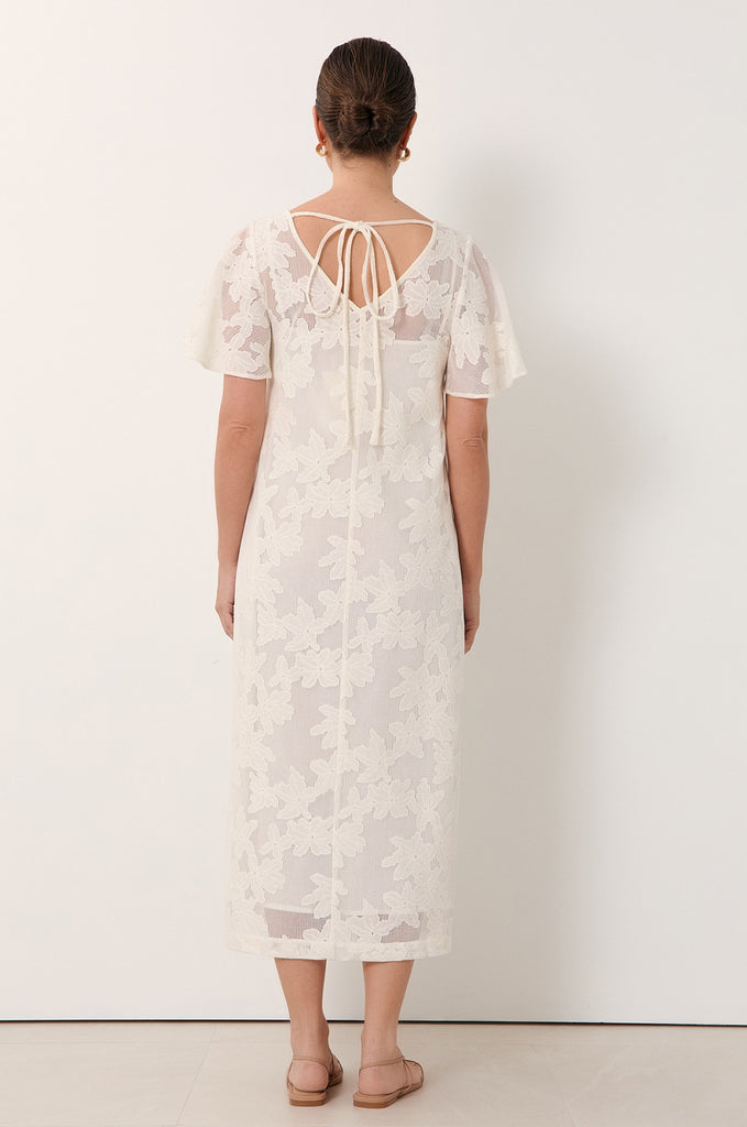 The Harlow Midi Lace Dress is made from a patterned lace blend in ivory white. It features an open V-neckline, flutter sleeves, and a back neckline tie. Designed in a midi length and includes a slip for coverage.