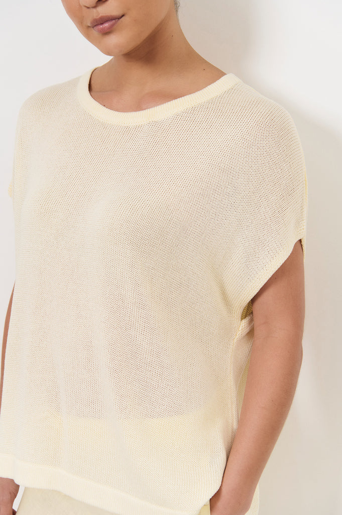 The Helene Knit Top in Lemon features a round neckline, ribbed edges, and side hem splits for added movement. Designed in a relaxed silhouette for easy, everyday wear.
