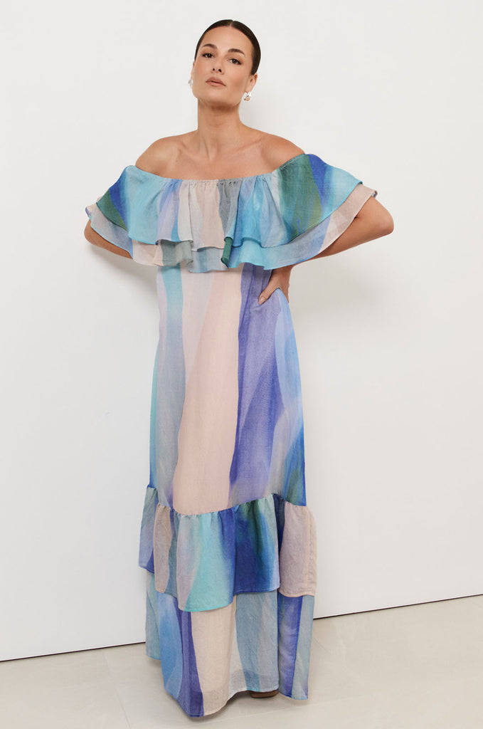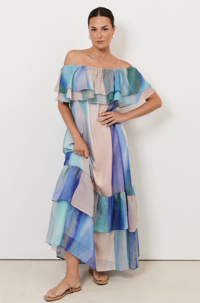 The Kalani Frill Maxi Dress (Print) is crafted in an exclusive adorne print. Cut from a sheer, lightweight fabric with internal lining, it features frills through the bodice, a tiered hem, and an off-shoulder neckline. Sleeves can be styled three ways: off the shoulder, one-shoulder, or on the shoulders.