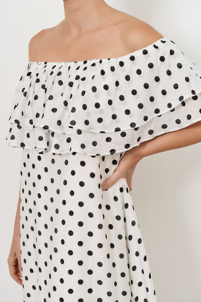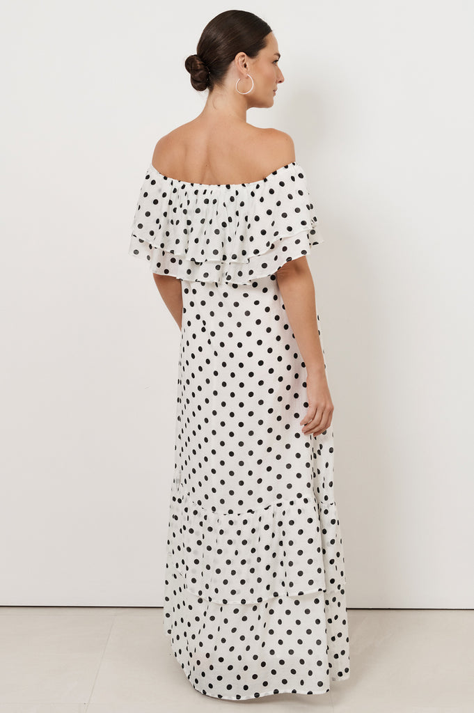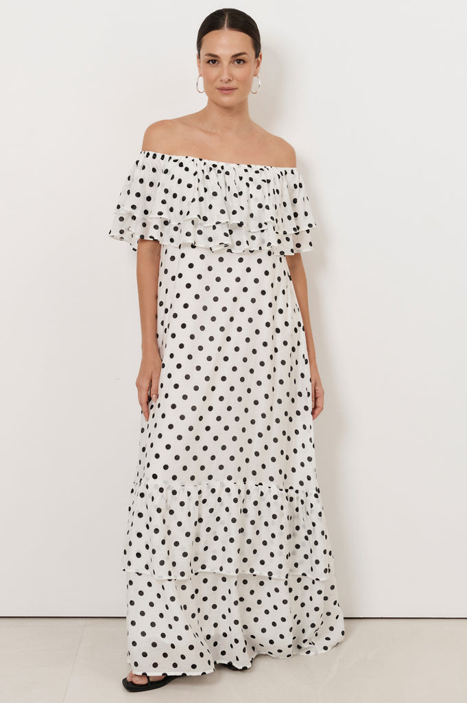 The Kalani Frill Maxi Dress (Spot) is crafted in an exclusive adorne print. Cut from a sheer, lightweight fabric with internal lining, it features frills through the bodice, a tiered hem, and an off-shoulder neckline. Sleeves can be styled three ways: off the shoulder, one-shoulder, or on the shoulders.