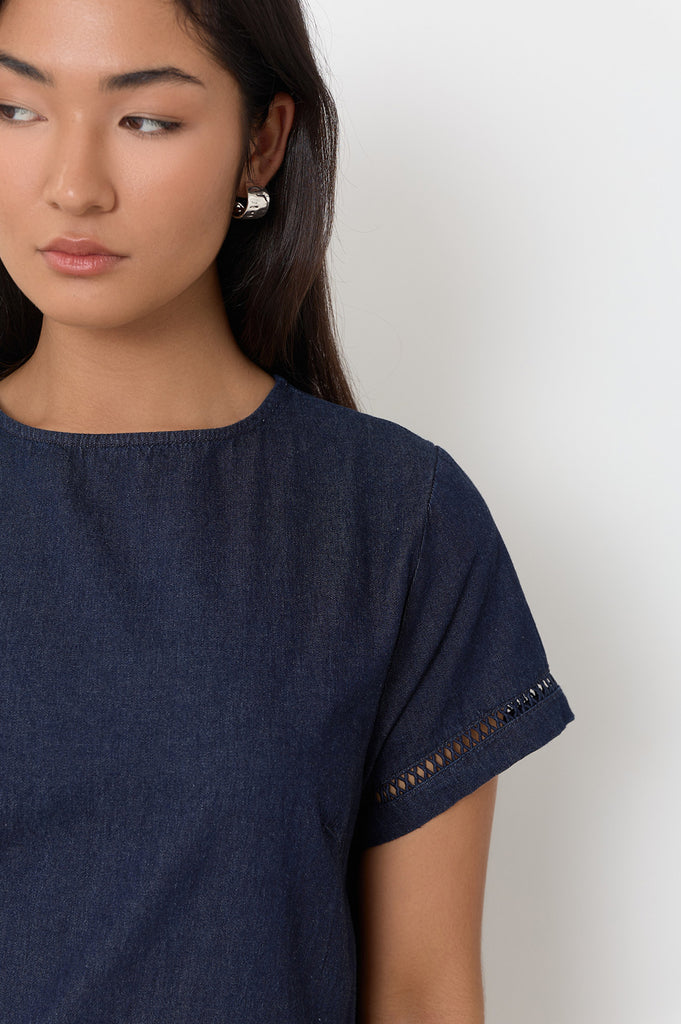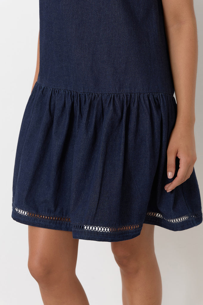 The Leonie Dress is made from lightweight denim and finished with lace trim detailing. It features short sleeves, a round neckline, a tiered hem, and a button-and-loop closure at the back.