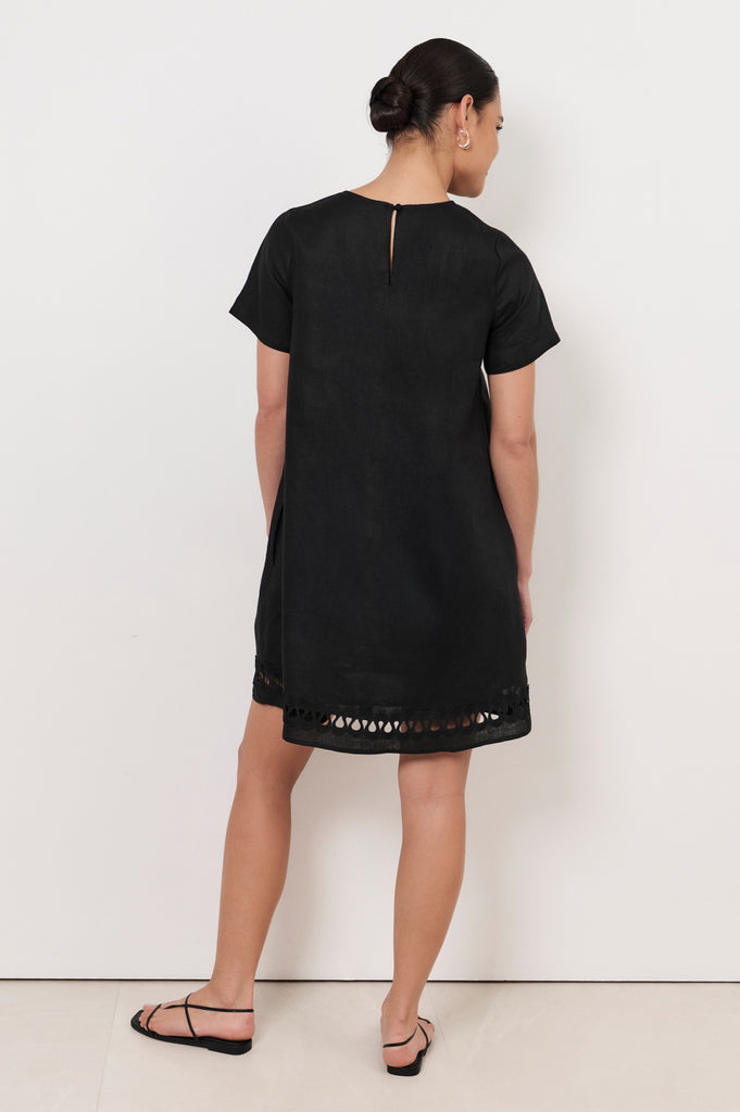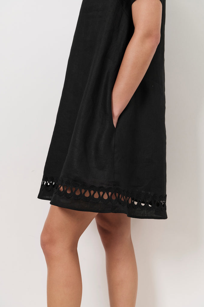 The Lexi Ric Rac Trim Short Dress in Black is crafted from 100% linen and features a relaxed silhouette with short sleeves and a subtle boat neckline. Detailed with ric rac trim along the hem and finished with a button and loop back closure.