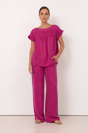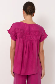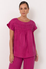 The Lira Pleated Cupro Top in Magenta is crafted from a soft cupro–viscose blend with a round neckline and short sleeves. It features a relaxed silhouette with ruching through the yoke.