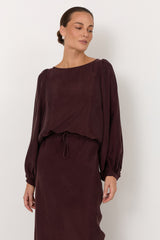 The Mae Cupro Skirt in Plum is cut on the bias from soft cupro. It features an elasticated waistband with a thin drawstring and relaxed fit.