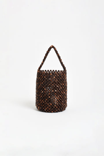 The Marble Bead Mini Bag in Chocolate features a structured top-handle design with an open top and flat base. Each resin bead is uniquely coloured.