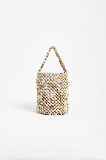 The Marble Bead Mini Bag in Chocolate features a structured top-handle design with an open top and flat base. Each resin bead is uniquely coloured.