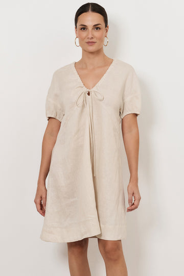 The Maura Tie Detail Short Dress in Stone is crafted from 100% linen and cut to a relaxed silhouette. It features a V-neckline with a self-tie, short sleeves with elastic cuffs, and angled seamlines through the bust for subtle shape.