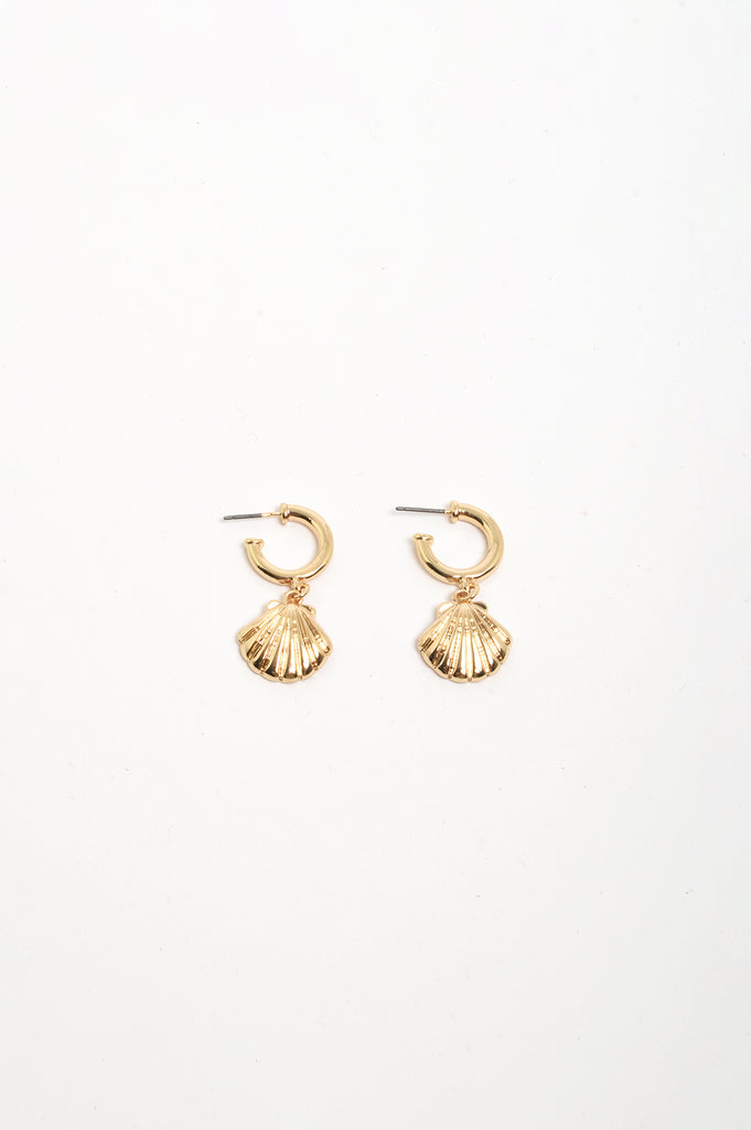 The Mini Metal Shell Hoops in Gold feature a small shell drop detail on a mini hoop with a stud back closure. They are crafted from plated metal and are nickel-free.