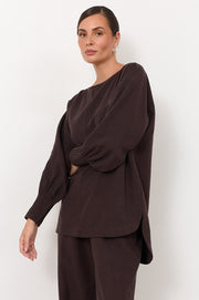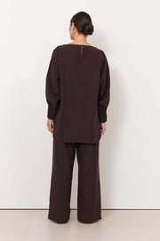 The Olas Batwing Top in Chocolate is crafted from a lyocell–linen blend with a soft drape. Designed with a boat neckline, batwing sleeves and pleated cuff detailing, it features a centre front seam, stepped hem and a button and loop closure at the back.