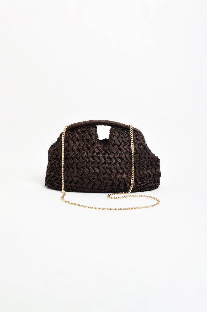 The Open Handle Paper Weave Clutch in Choc features a contrast weave design with a hinged frame closure and open handle detail. Finished with an internal pocket and an optional chain strap.
