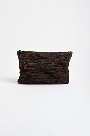 The Paper Weave Large Pouch in Chocolate is crafted from woven raffia, this large pouch features a zip closure with a tassel detail and a soft lined interior.