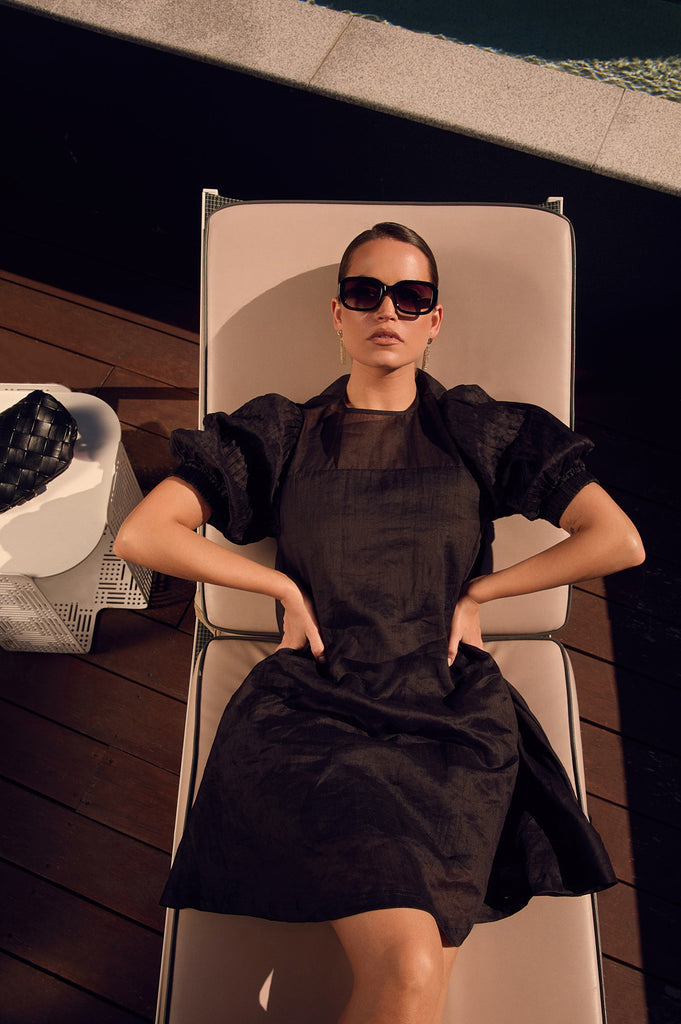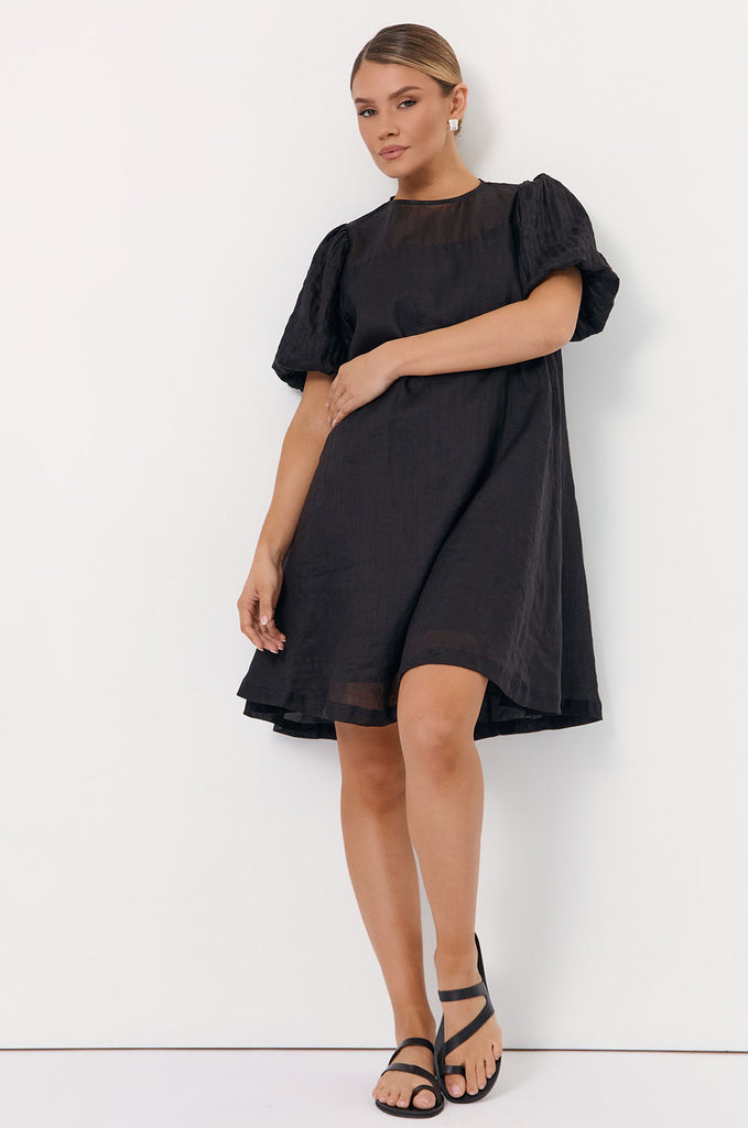 Perrie A-line Ramie Puff Sleeve Dress (Black)