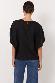 The Phoebe Top in Black is crafted from a linen rayon blend with a round neckline and drop shoulder detail. Designed with elasticated sleeves and a button and loop back closure, it has a relaxed fit.