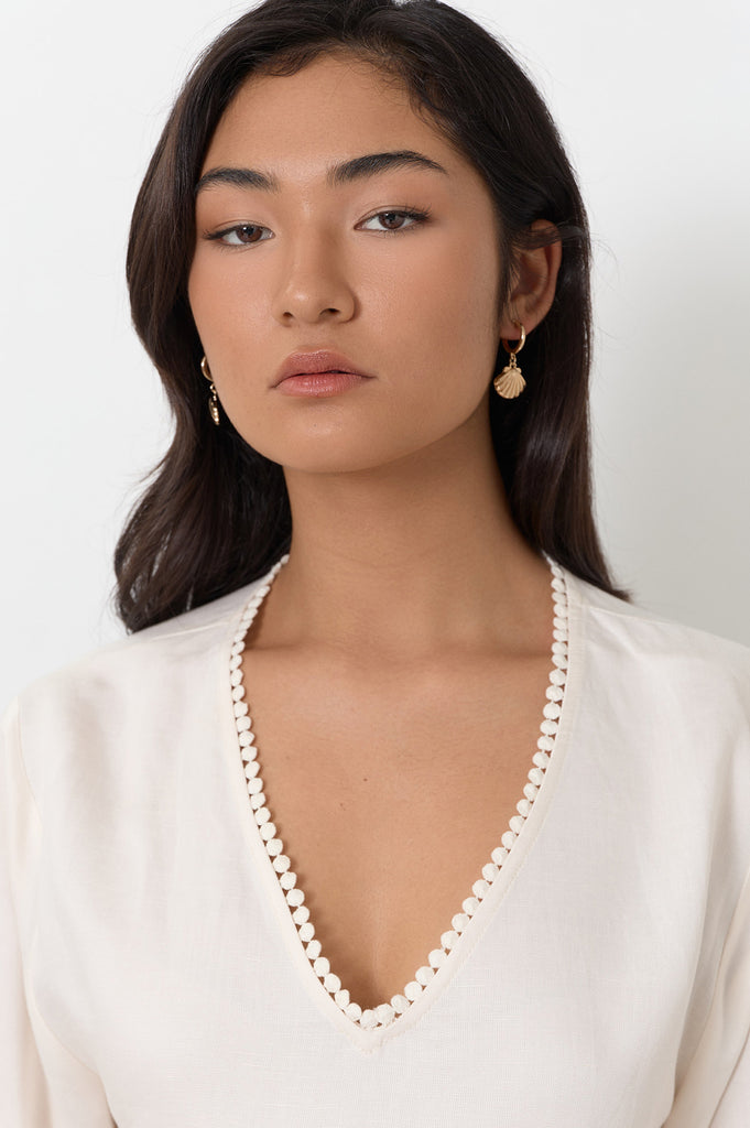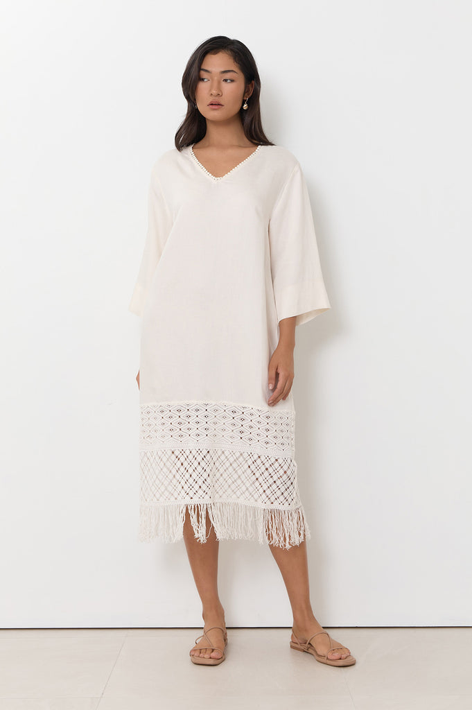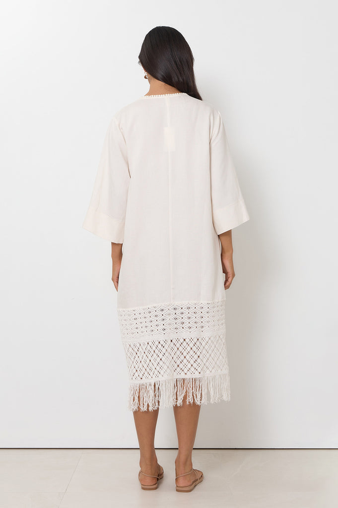 The Reyes Fringe Detail Dress in Cream is cut from a linen–rayon blend with a relaxed silhouette. It features a V-neckline, subtle kaftan sleeves, and fringe trim at the hem.