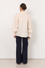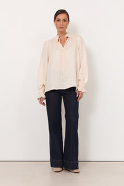 The Sandra Long Sleeve Linen Top in Cream is crafted from 100% linen with a V-neckline and tie closure. Designed with frill neck detailing, long sleeves with elasticated cuffs, a straight hem and side hem splits.