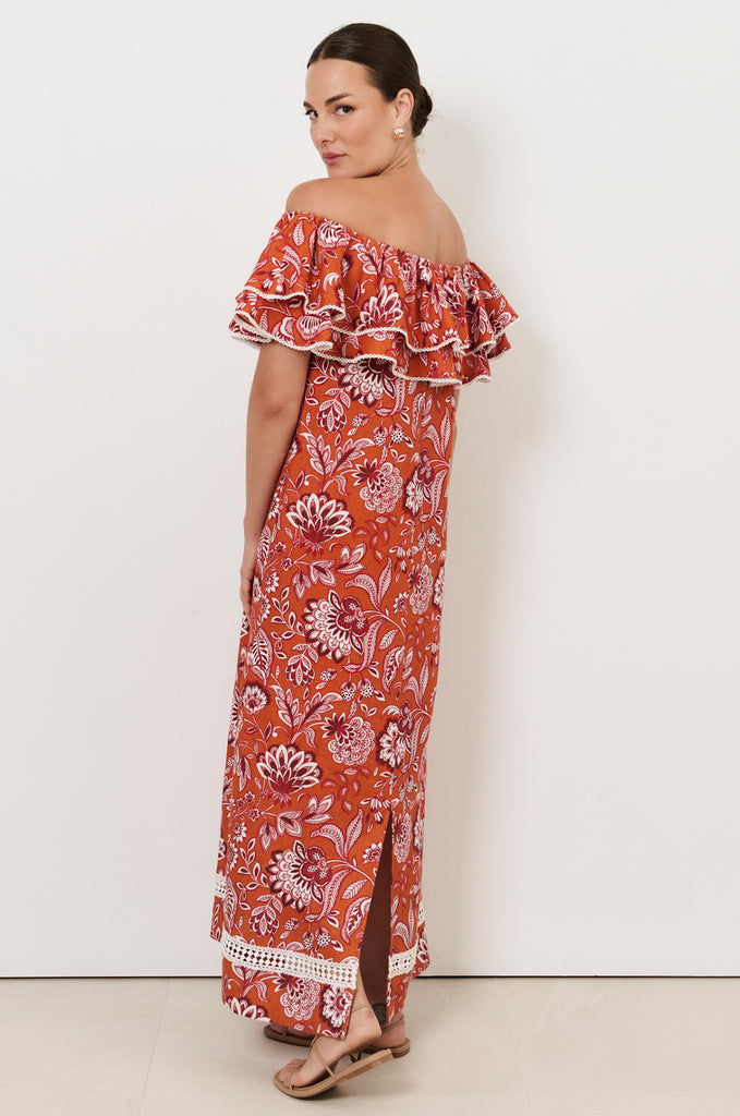 The Serena Linen Frill Dress in Print is crafted from 100% linen in an exclusive Adorne print. Designed with a relaxed silhouette, it features a frill neckline with elasticated detailing, trim finishes, and a back hem split.