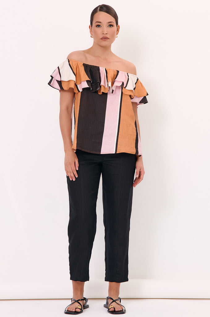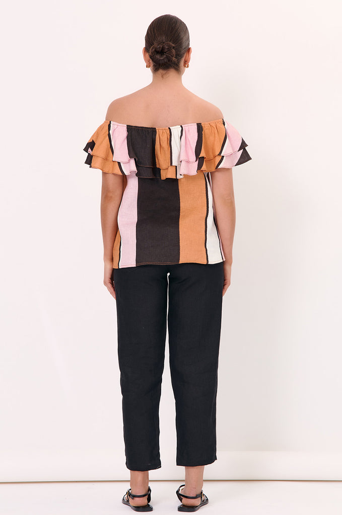 The Serena Linen Frill Top is crafted from 100% linen in an exclusive stripe. Designed with a layered frill, elasticised neckline and dipped hem, it can be worn off, on, or one shoulder for a relaxed, versatile look.